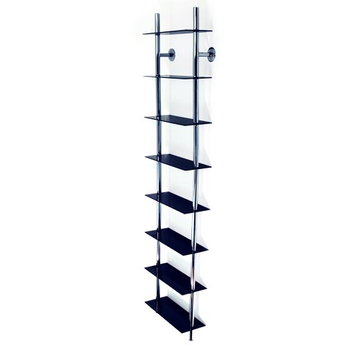 Tall wall mounted black glass shelves with a sturdy tubular chromed frame. Resting on the ground with two securing plates at the top for attaching to a wall this 8 tier unit is ideal for DVDs, Blu-rays, computer games, CDs, books, collectables or ornaments. This unit holds approx 240 CDs or 160 DVDs / Blu-rays / computer games. 20cm gap vertically between each of 8 fixed shelves. Distance from floor to bottom shelf: 10cm and from pole to wall 7cm.