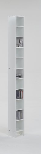 This freestanding white media shelving unit has 11 tiers for storing your CDs and DVDs, though it can also be used to many household decors and ornaments such as photos and small plants. 9 of the shelves can be adjusted to comfortably fit either your CDs and/or DVDs.